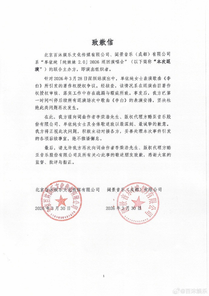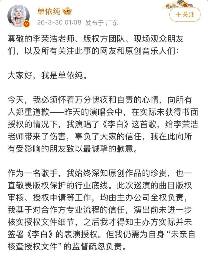 3月30日凌晨,单依纯、李荣浩接踵回复后,单依纯公司@百沐文娱也发致歉信,称单依纯扮演歌曲《李白》所激发的文章权授权争议,经核查,该情况系在巡演曲目文章权授权审核、落实责任中存谢世俗与舛误所致。