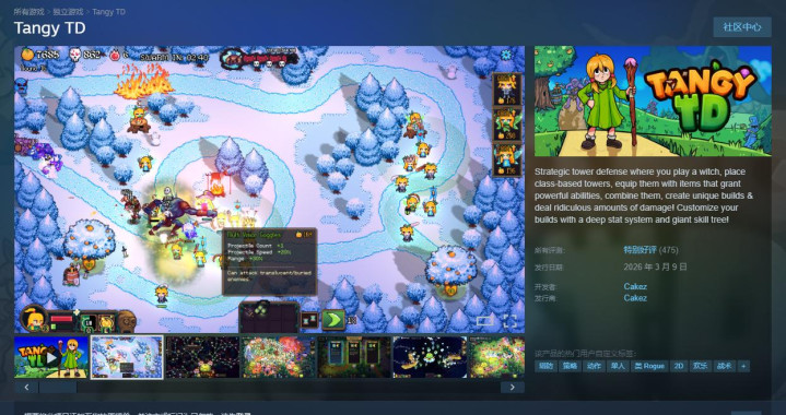 这款游戏叫 《Tangy TD》,一款像素风的计策塔防。