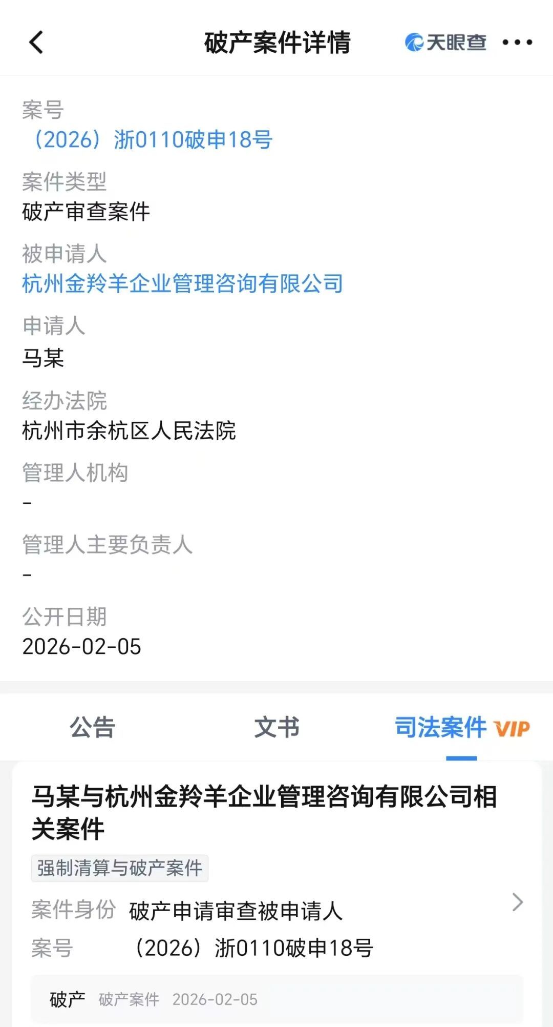 天眼查APP败露,驱散2月6日,杭州金羚羊有6条被履行东说念主信息,被履行金额跳跃1.4亿元;历史被履行东说念主信息16条,被履行金额跳跃3.2亿元。该公司失信被履行东说念主信息9条,涉案金额跳跃5879万元。此外,还有26条股权冻结信息。