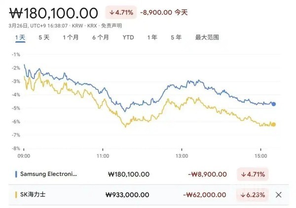 好意思股商场的颠簸情绪马上扩展至亚洲存储芯片商场。韩国两大存储巨头股价同步下落,韩国SK海力士股价下落6.23%,市值亏损44.18万亿韩元;三星电子下落4.71%,市值亏损57.83万亿韩元。