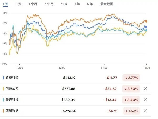 在谷歌发布TurboQuant后的第一个好意思股交游日,存储芯片板块在盘中集体跳水,多家中枢企业均际遇不同历程的市值冲击。闪迪股价一度大跌6.5%,收盘时跌幅收窄至3.5%,市值亏损36.3亿好意思元;好意思光科技下落3.4%,市值亏损151.66亿好意思元;西部数据下落1.63%,市值亏损16.64亿好意思元;希捷科技下落2.76%,市值亏损21.4亿好意思元。