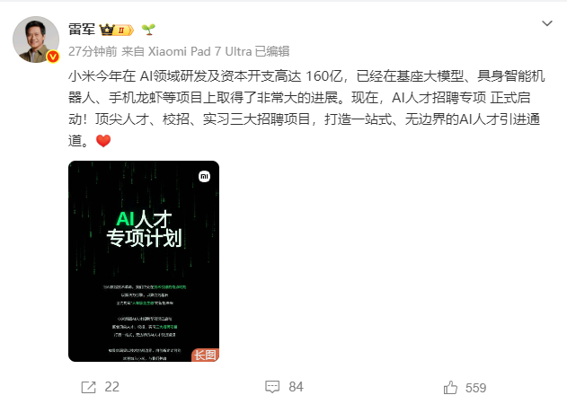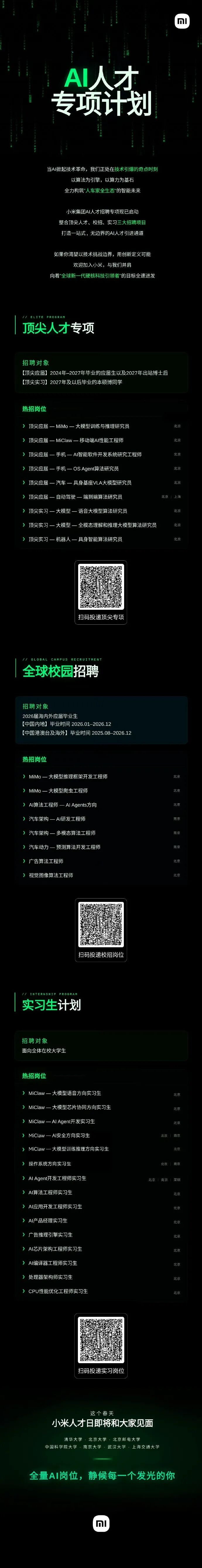 3月30日,小米创办东说念主、董事长兼CEO雷军发文示意,小米本年在AI范畴研发及本钱开支高达160亿元,米兰(中国)官方网站已在基座大模子、具身智能机器东说念主、手机龙虾等技俩上获得了特殊大的证据。现时,AI东说念主才招聘专项精良运行!顶尖东说念主才、校招、实习三大招聘技俩,打造一站式、遍及界的AI东说念主才引进通说念。