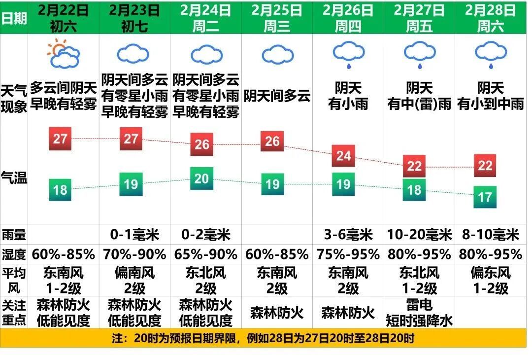 22日(初六):韶关、清远和肇庆市县多云间阴天,有小雨,其余市县多云间阴天,局部有脱落小雨,大部市县朝夕有(轻)雾。清晨最低气温:粤西和珠江三角洲中南部市县17~20℃,其余大部市县13~16℃。